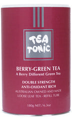 Tea Tonic Tube Berry Green – 180gm net. DOUBLE STRENGTH & ANTI-OXIDANT RICH. A fragrant blend of green tea giving a subtle pallet of strawberries, raspberries and redcurrants, balanced with the soft tannins of green tea. This sophisticated tea provides the stimulus of caffeine (which green tea naturally contains) and the advantages of the extra anti-oxidants of berries.
